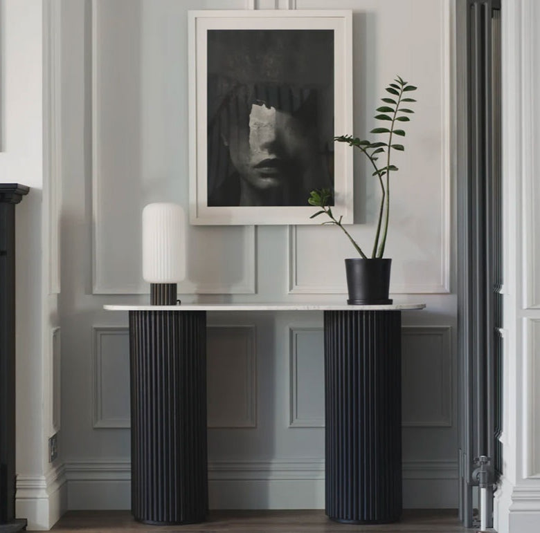 Cette pièce saisissante est dotée d'un élégant plateau de MDF effet marbre blanc avec des extrémités douces et arrondies qui lui permettent de s'adapter à des espaces plus restreints. La dalle de marbre est soutenue par deux grosses colonnes en bois finies en noir avec un élégant motif nervuré. La combinaison de textures rugueuses et lisses avec des surfaces mates et brillantes ajoute de la profondeur et de l'intrigue à votre projet de décoration intérieure.
